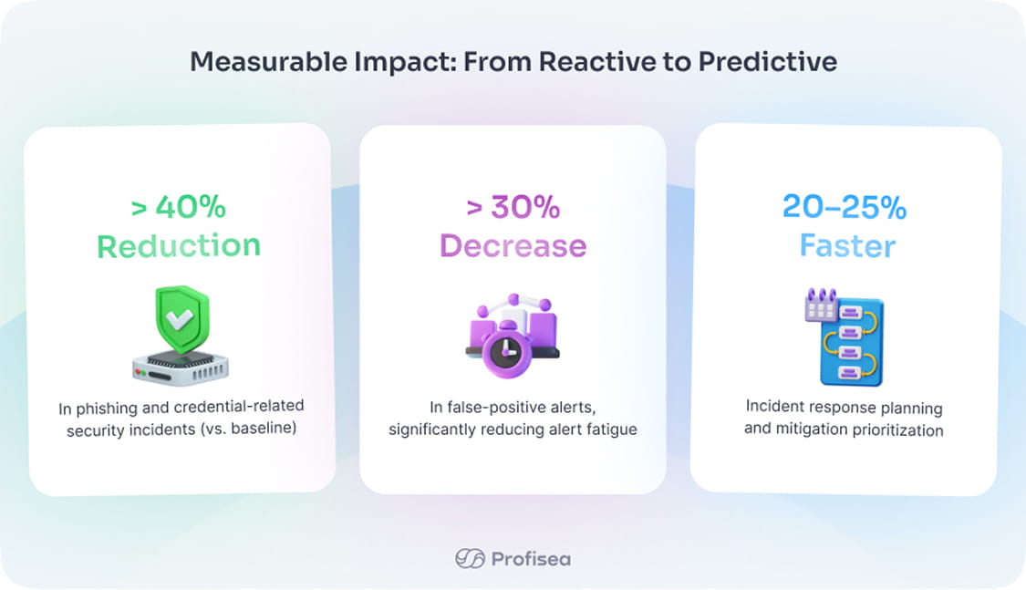 Internal benchmarking and customer validation further indicate a substantial decline in credential exposure recurrence events and a reduction in false-positive alerts exceeding 30% when compared to traditional rule-based detection systems. This improvement significantly alleviated alert fatigue and enhanced security team focus.