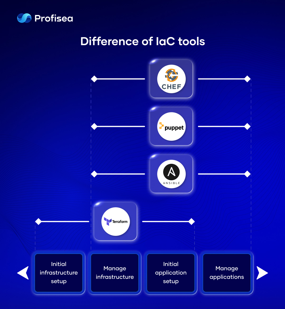 AWS CloudFormation, Azure Resource Manager, Google Cloud Deployment Manager, Terraform, Ansible, Chef, Puppet, Pulumi… A very good question is why there are so many different IaC tools. Can’t we just use one that heals everything? Well, currently, no IaC tool can do everything from start to finish. Each tool can do parts of automation tasks, which means each one is good in specific areas.
